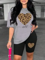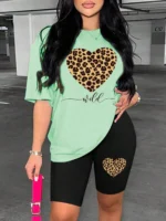 Leopard Heart Pattern Two-Piece Set – Fashionable and Comfortable Women’s Short-Sleeved Shorts Outfit